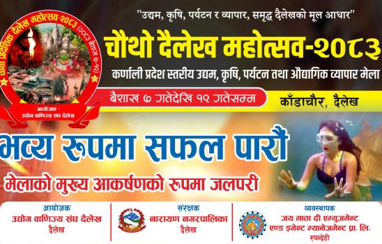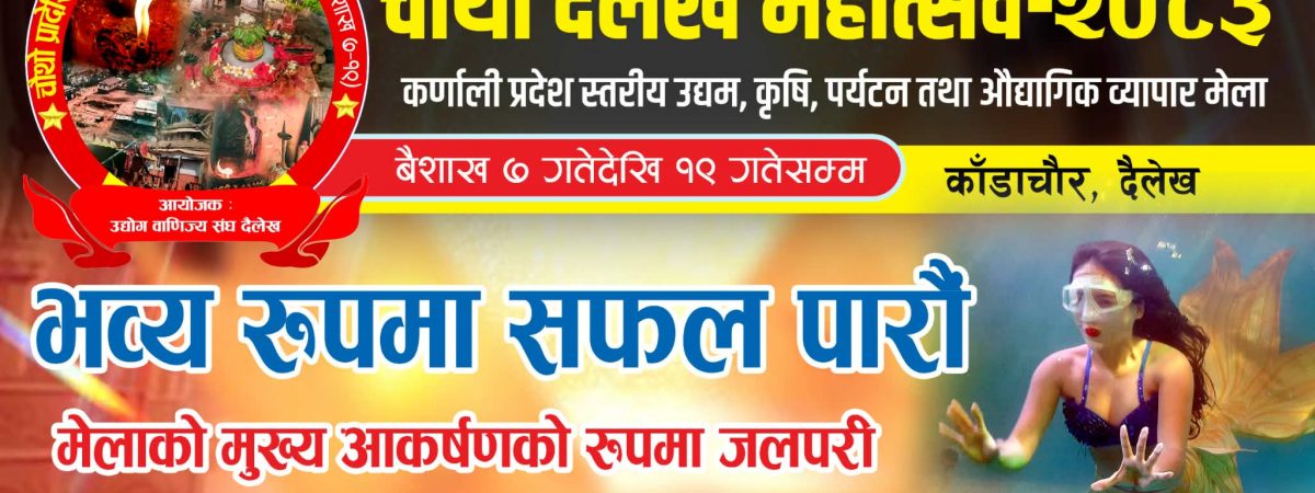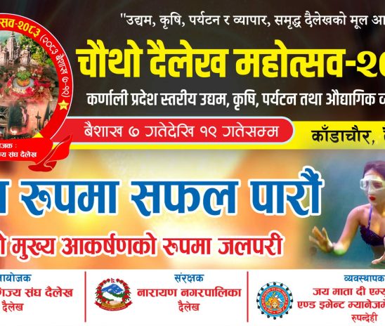 दैलेख उघोग बाणिज्य संघ दैलेखले कर्णाली प्रदेश स्तरिय चौथो उघम कृर्षि पर्यटन तथा औघागिक व्यापार मेला २०८३ को तयारी पूरा भएको छ । कृर्षी उघम पर्यटन र व्यापार,समृद्द दैलेखको मुल आधार भन्ने मुलमन्त्र ठानी कर्णाली प्रदेश स्तरिय चौथो उघम कृर्षी…
