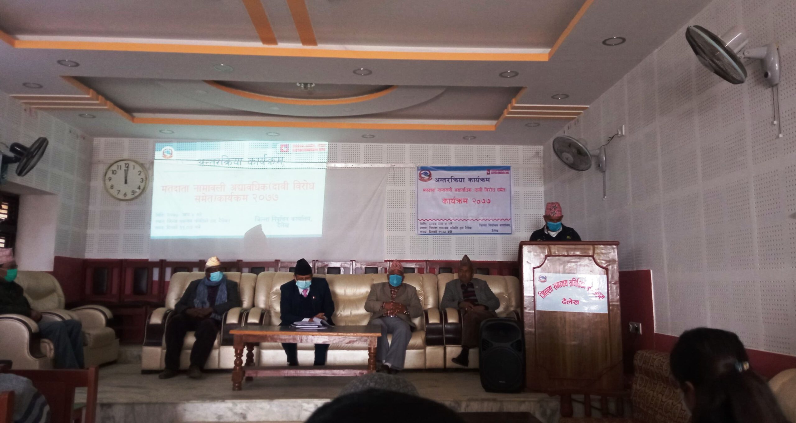 सोहि बमोजिम जिल्ला निर्वाचन कार्यालय दैलेखले आइतवार मतदाता नामावली अद्यावधिक (दाबी विरोध समेत) अन्तरक्रिया गरेको छ । प्रमुख जिल्ला अधिकारी सन्तबहादुर सुनारको अध्यक्षतामा आयोजित कार्यक्रममा जिल्ला निर्वाचन कार्यालयका प्रमुख कुमारी रिमा मल्लले कार्यालयले गर्न लागेको कामहरुबारे जानकारी गराइन् ।