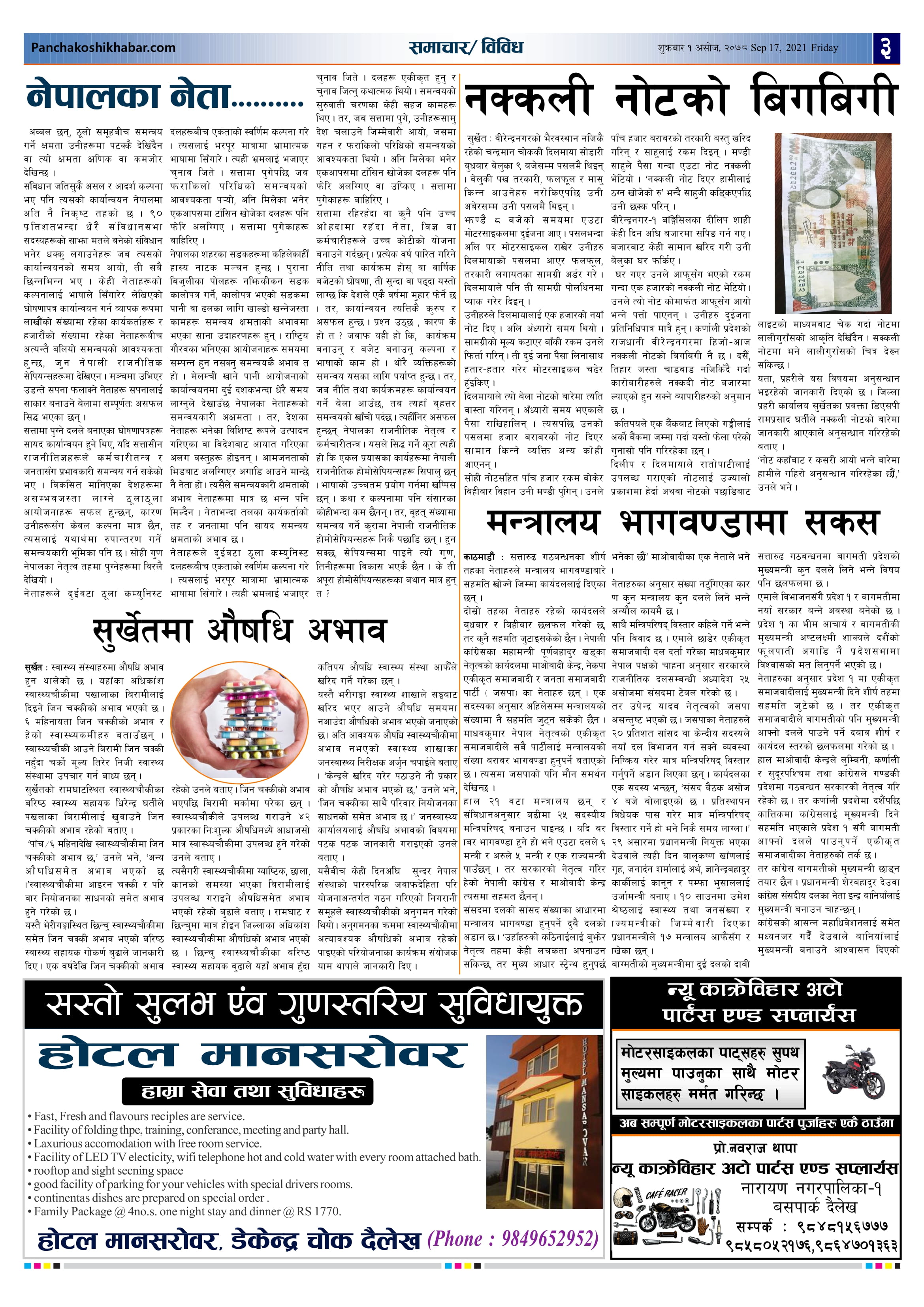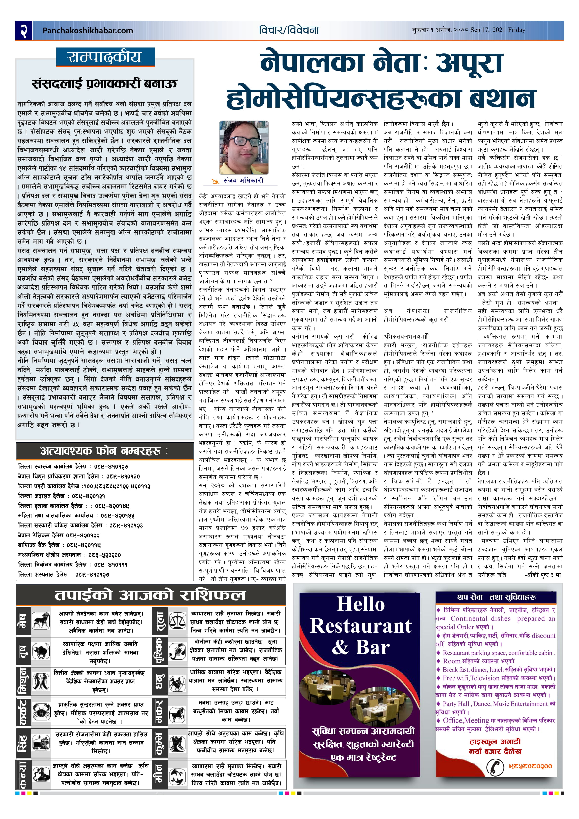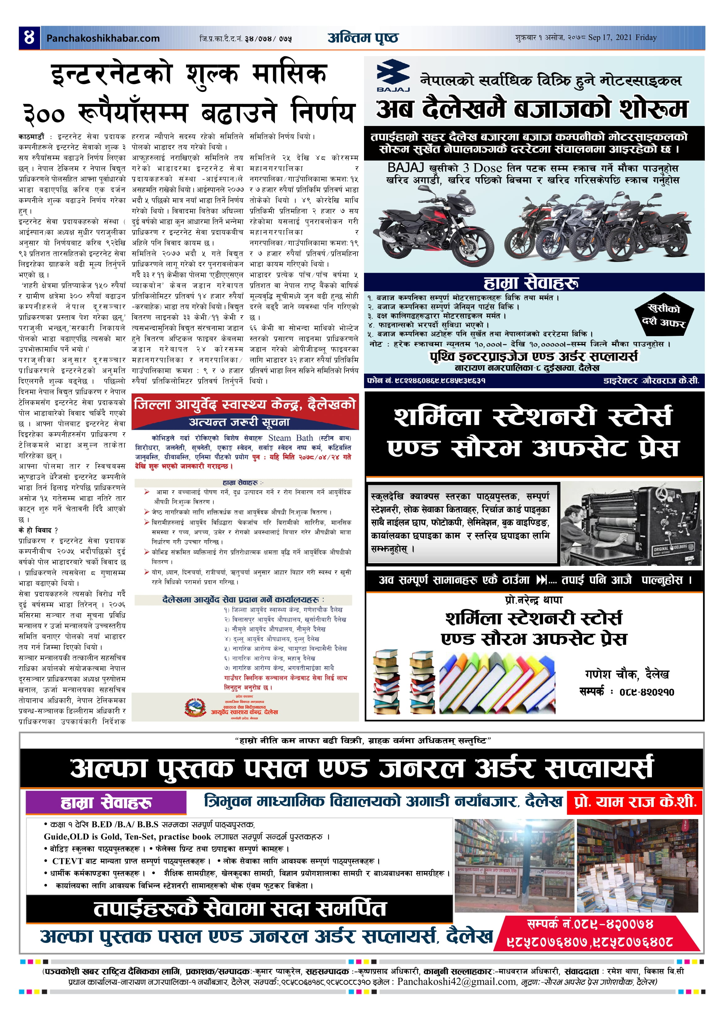 मिति २०७८ असोज १ गते प्रकाशित पंचकोशी खबर दैनिक कृष्णप्रसाद अधिकारी । २०७८ आश्विन ९, शनिबार मा प्रकाशित